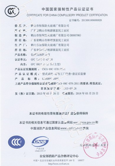 鶴山市恒保防火玻璃廠有限公司在陳總經(jīng)理的領(lǐng)導(dǎo)下,跟全體員工的共同努力下,于2013年3月18日通過國家防火建筑材料質(zhì)量監(jiān)督檢驗中心的檢測,最終通過由公安部消防產(chǎn)品合格評定