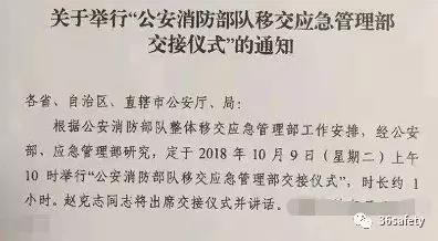 據(jù)多家媒體披露,根據(jù)公安消防部隊(duì)整體移交應(yīng)急管理部工作安排,經(jīng)應(yīng)急管理部、公安部部門研究,定于2018年10月9日(周二)上午10時舉行“公安消防部隊(duì)移交應(yīng)急管理部交接儀式”,時長約1小時,公安部部長趙克志將出席交接儀式并講話,主會場設(shè)在公安部機(jī)關(guān)樓。