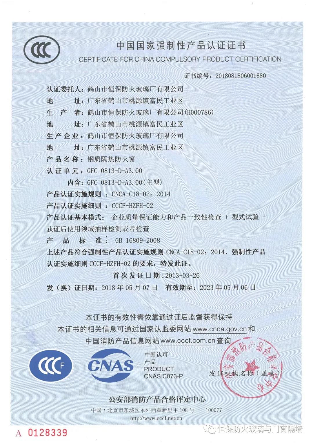 截止2018年10月,已獲得國家“CCCf”主型產(chǎn)品認(rèn)證證書36張,評定中心網(wǎng)上公告報告55份,四川中心公告26份,天津中心公告2份,英標(biāo)、歐標(biāo)、澳標(biāo)、美標(biāo)檢驗(yàn)報告35份評估報告20份,耐火窗等其他性能測試報告16份,恒保公司共獲報告154份涵蓋0.5小時至4小時防火系列產(chǎn)品,并擁有防火玻璃與門窗類專利21項(xiàng)。