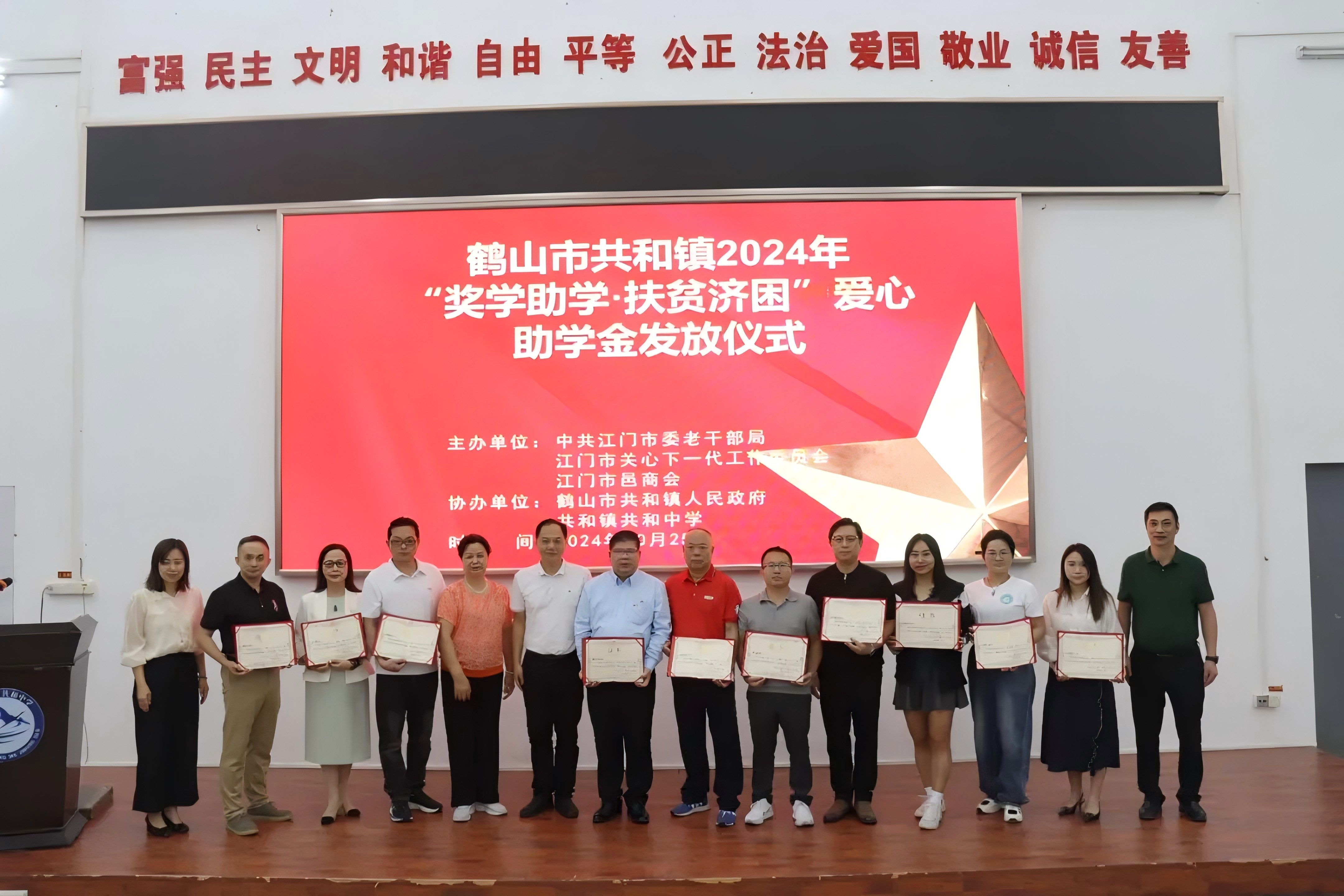 2024年10月25日,江門市委老干部局、江門市關(guān)工委、共和鎮(zhèn)委鎮(zhèn)政府,攜手江門市邑商會(huì),在共和中學(xué)舉行了“獎(jiǎng)學(xué)助學(xué)·扶貧濟(jì)困”愛心助學(xué)金發(fā)放儀式,為我鎮(zhèn)優(yōu)秀困難學(xué)子筑夢未來。這次活動(dòng)讓我回想起自己當(dāng)年小學(xué)初中求學(xué)時(shí)的情景,感慨萬千,同時(shí)提升了我個(gè)人和《灣區(qū)華商》在公眾心目中的形象。這是一次愛心的傳遞,更是一次精神的洗禮,激發(fā)了廣大學(xué)生的學(xué)習(xí)熱情,為共和鎮(zhèn)教育事業(yè)的發(fā)展注入了新的動(dòng)力。