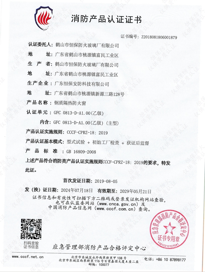 甲級固定防火窗消防產(chǎn)品認證證書: